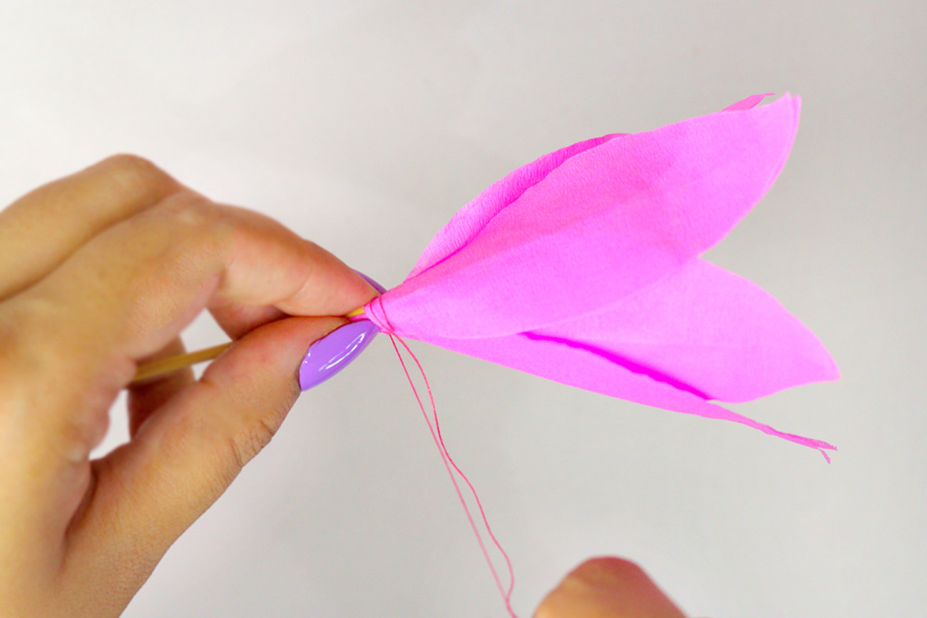 Insert the wooden skewer inside the flower. Wrap the thread around the skewer several times and tie a knot to secure the flower.