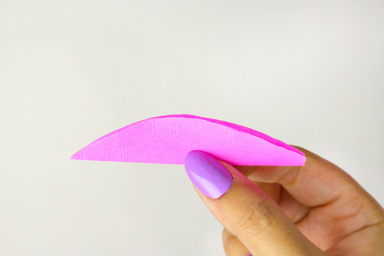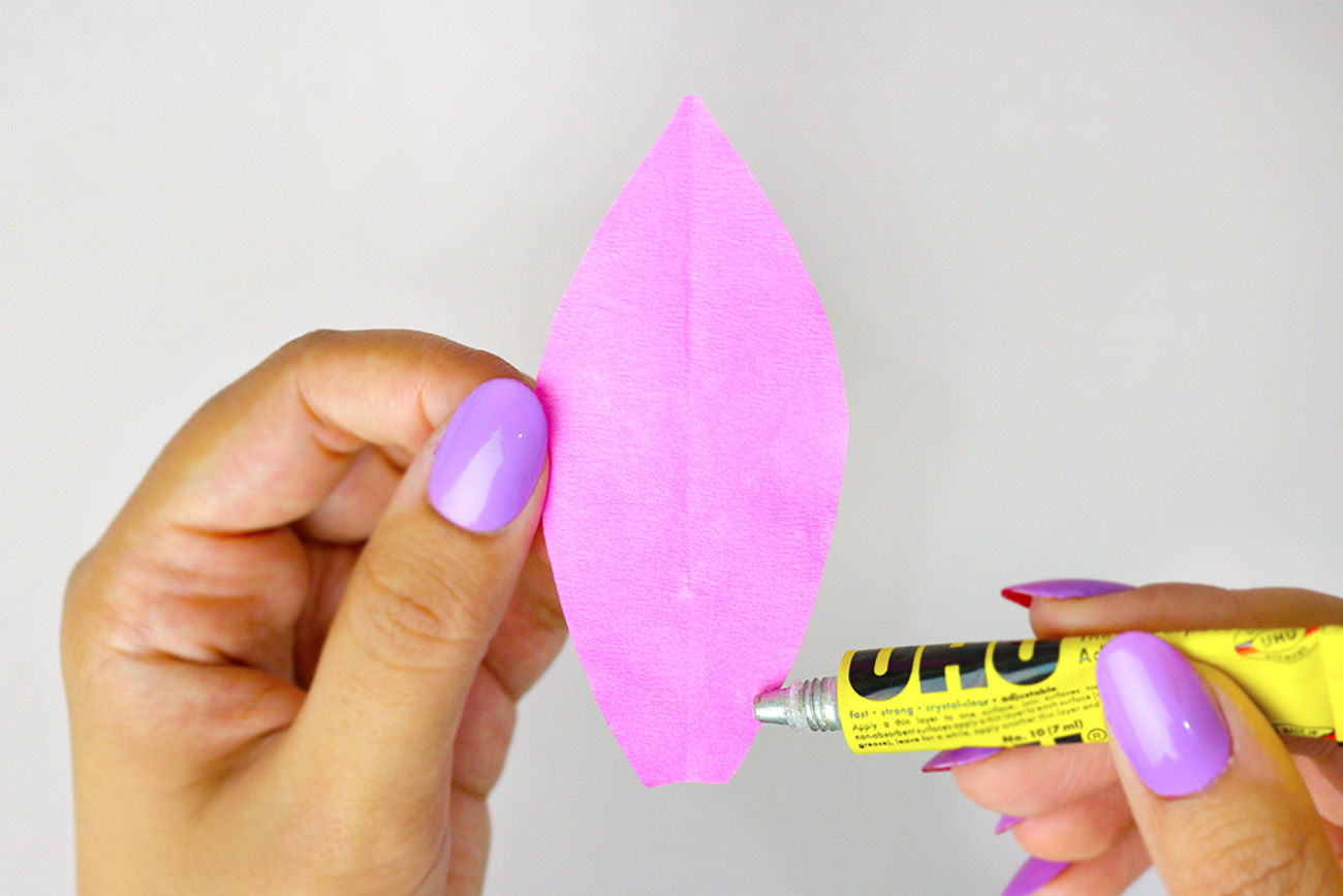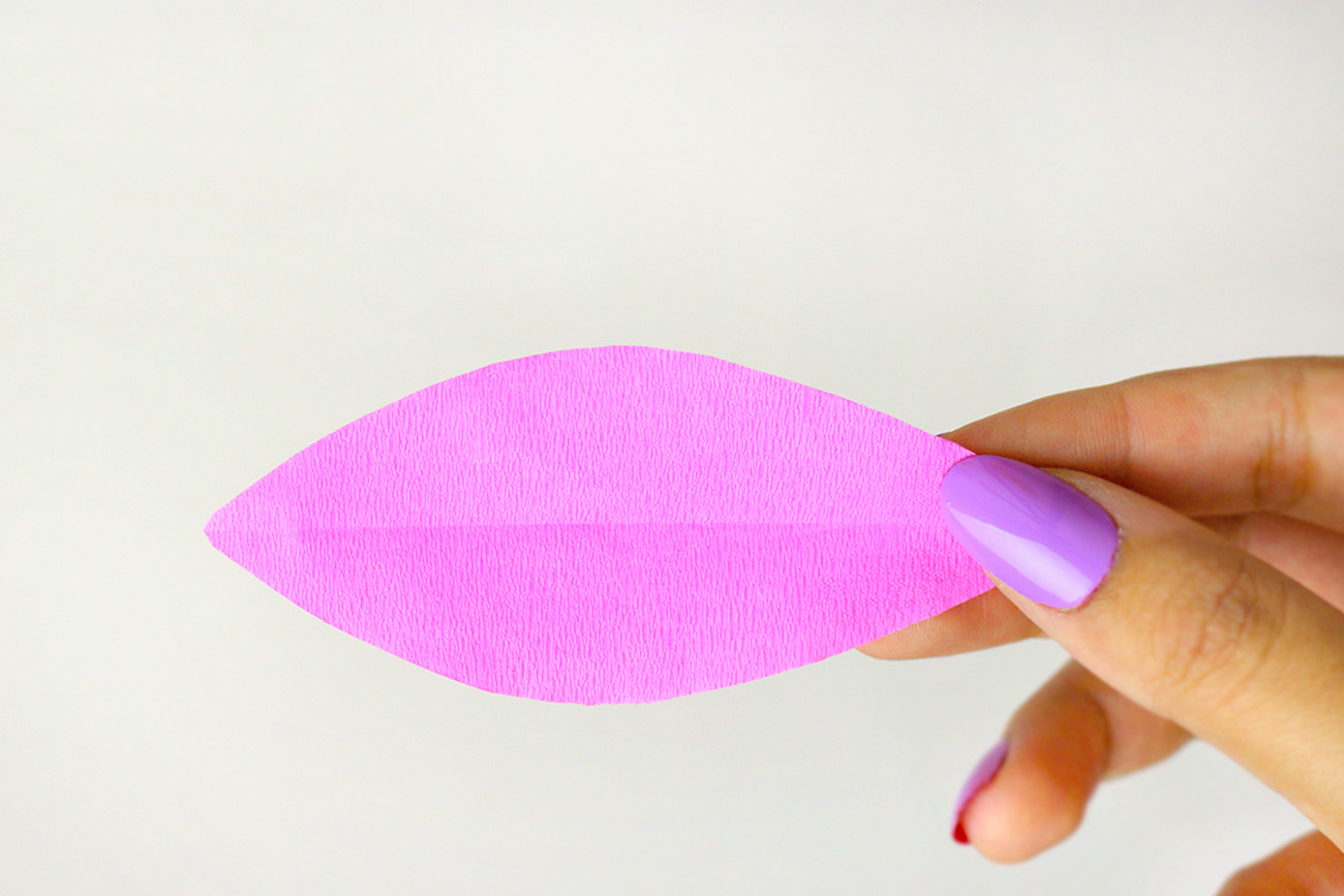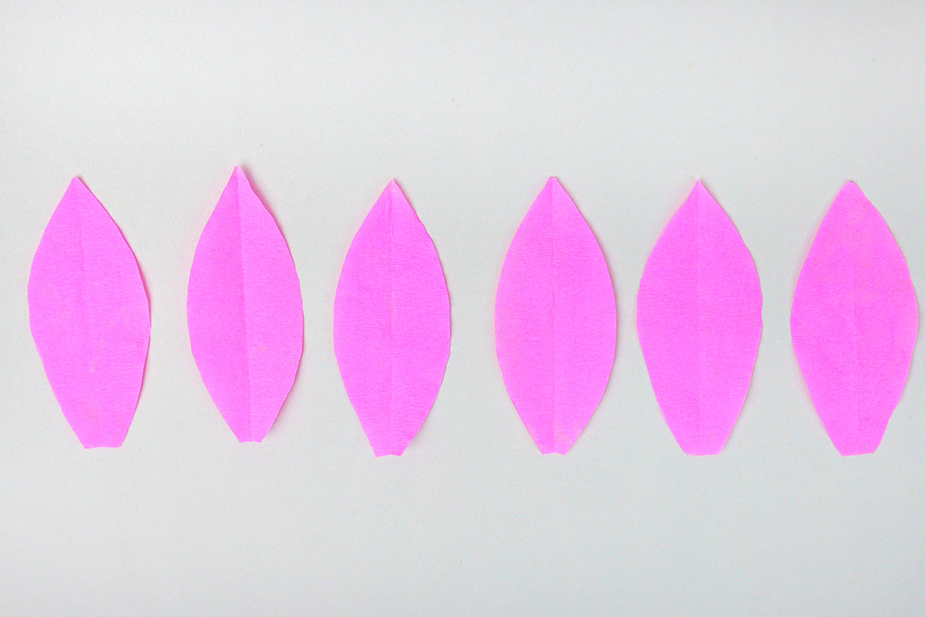 Cut six pieces measuring 2.5 x 7 cm from green crepe paper. Fold each piece in half lengthwise and then cut it into a leaf shape.