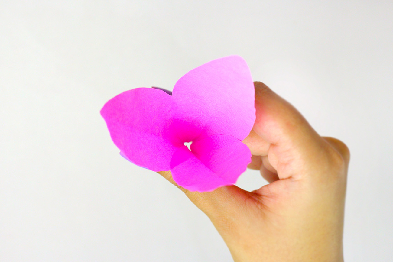 Now, take the fourth petal and apply glue to the bottom of it. Then, stick it at the center of the two existing petals, as demonstrated below. Repeat the same process with the remaining two petals.