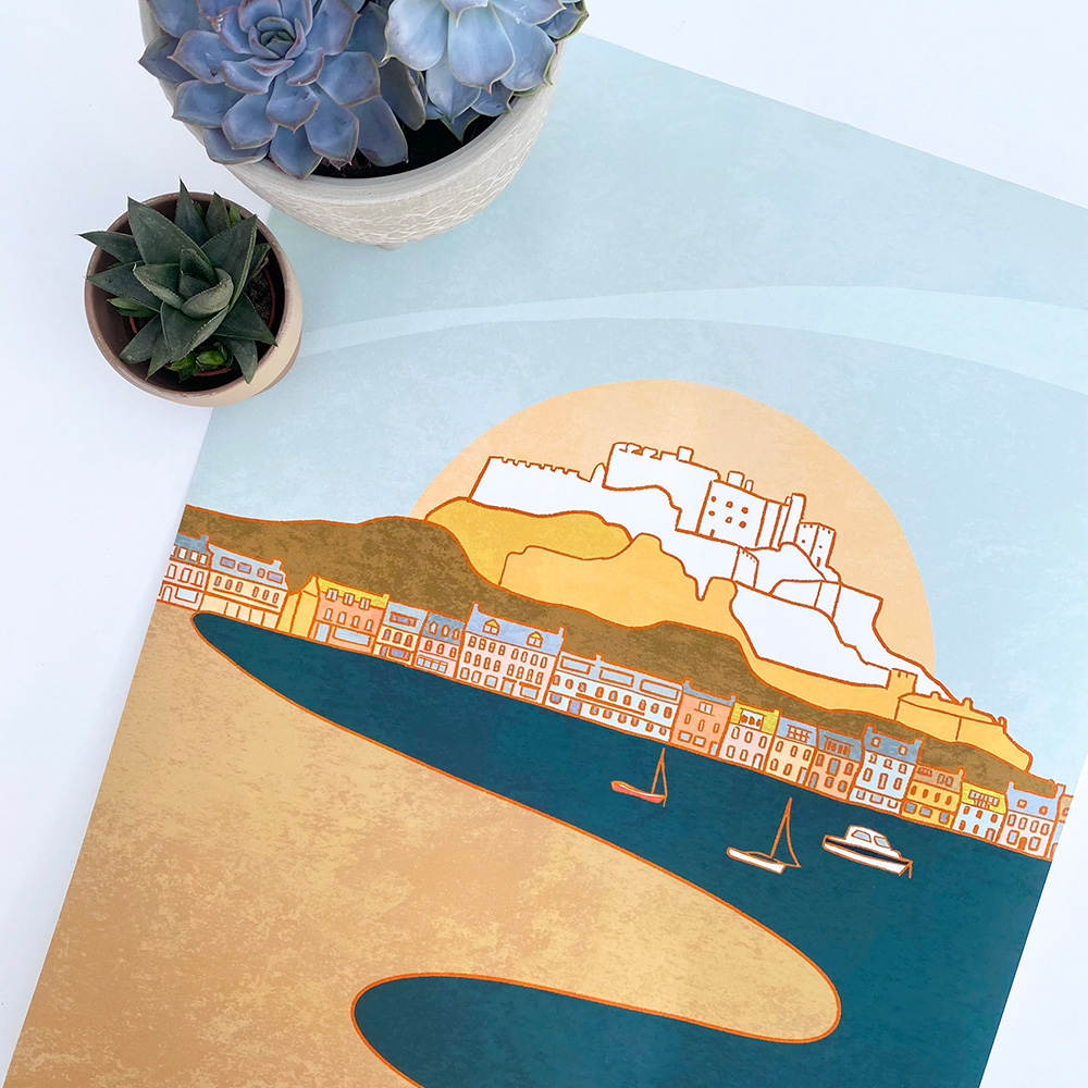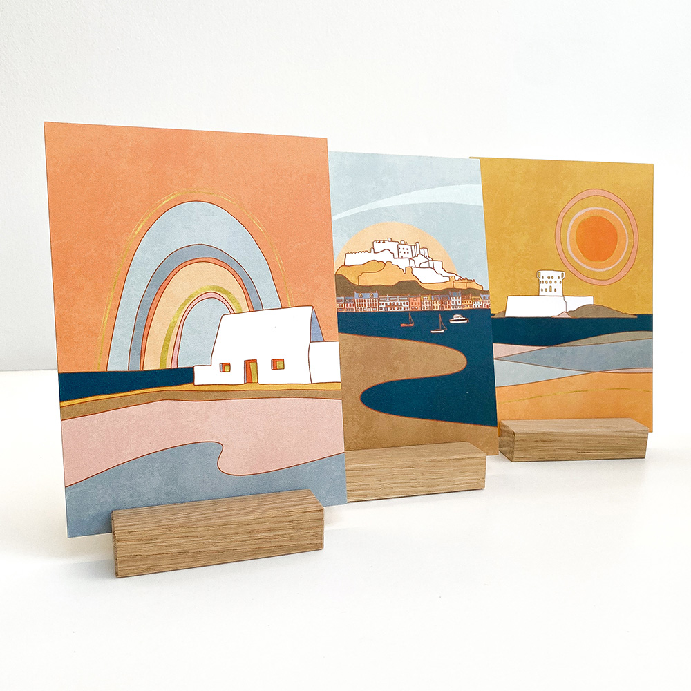 I wanted the colours to have a retro feel to them – the influence here is probably me being a child of the 70s! All of the landmarks I have chosen I have connection to and memories of spanning all the years I have lived in Jersey. Within each of those designs there is a motif – the landmark or point of interest is always white and the rest of the entire colour palette is the same.