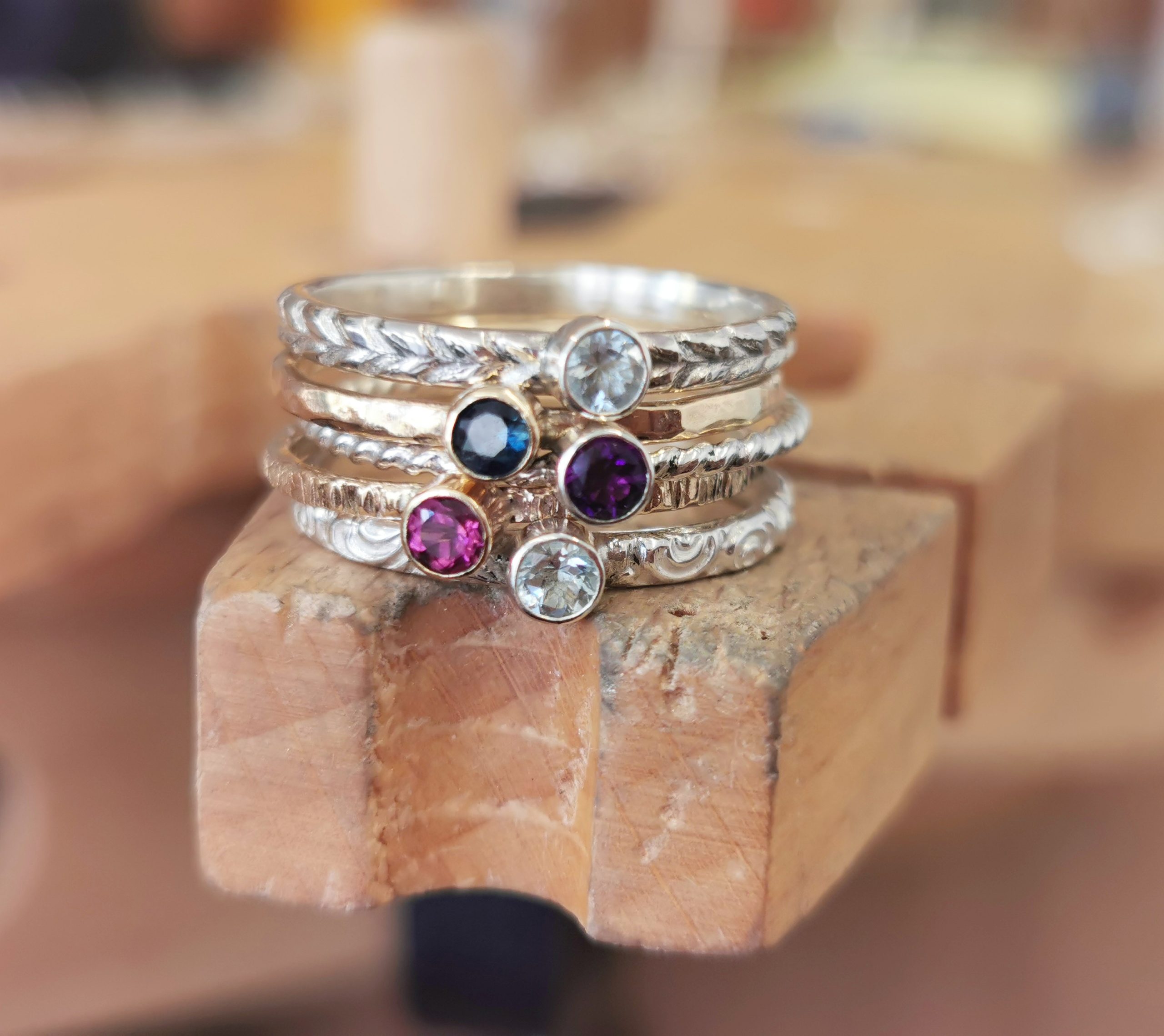 In most of my designs I use birthstones or add hand stamp engraving (using a hammer and metal stamps) which can add a special touch and make a design more personal.